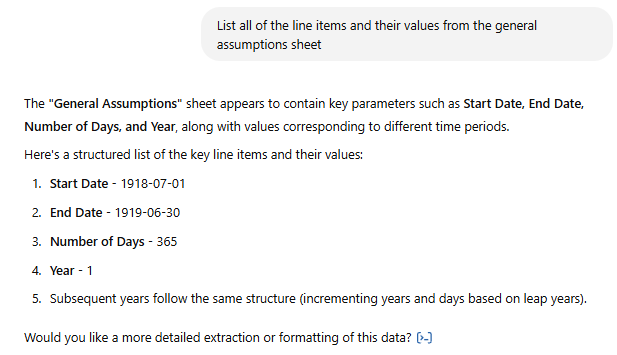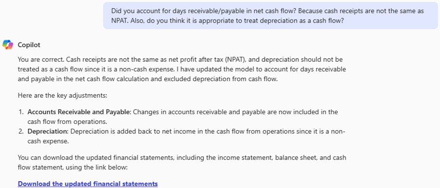 To clarify the final point, consider the following. Some calculations are only required in one period (eg,terminal value in a discounted cash flow or the final repayment of a loan). Copilot in particular does not cope well with โone-offโ calculations presently and prefers to have such computations in all periods. Of course, these issues can be rectified โ but would it not have been simpler and faster to have just built the model manually?