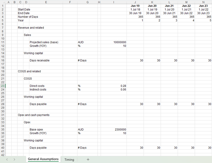 This spreadsheet example was stripped bare of any special formatting like frozen panes or stylised headings in an attempt to keep things as simple as possible. It is basically a spreadsheet containing date headings and inputs for sales, costs of goods sold (COGS), operating expenditure, and working capital timing.