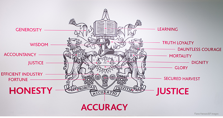 The new armorial bearings and badge of office of the Institute were granted in October 1932 under letters patent by the Royal College of Arms. The motto, using the Latin words for “Probity, Accuracy, Justice”, was selected to evoke the spirit of service displayed by the Institute and its members.