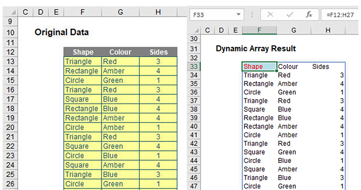 On the off-chance you are new to this series and don’t have the time or inclination to read the first three articles, here’s a (relatively) brief summary. Microsoft’s new Dynamic Arrays functionality greatly simplifies the process of working with arrays in Excel. There’s no more copying formulas to the entire range and having to press Ctrl+Shift+Enter to see multiple results. Instead, you enter a formula in one cell, and, poof, the data you are looking for just spill out. Look at the screenshots below. As you can see, the formula entered into cell F33 in the right image is =F12:H27, which references the original data shown in the left image.