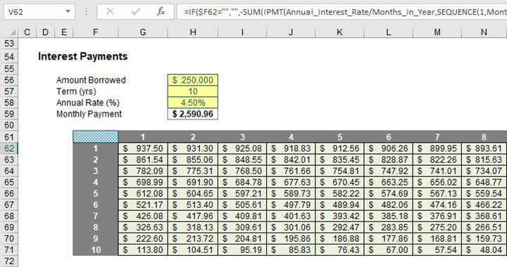 In this instance, I have created a grid using the Excel IPMT function to determine the amount of interest to be paid in each monthly instalment. Cells G62:R71 calculate each monthly amount and column T sums these amounts to calculate the annual interest payment, a figure that is nontrivial to compute. The whole table may be replaced by the formula in cell V62: