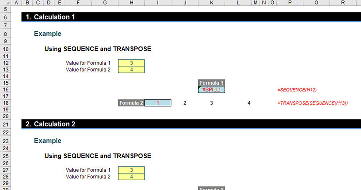 - In Calculations 1 and 2, both values for Formula 1 (cells H12 and H27) and Formula 2 (cells H13 and H28) were originally set to 1. This causes no #SPILL! errors.