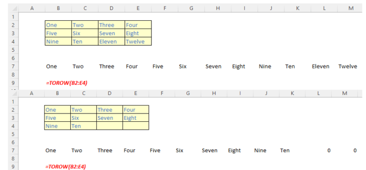The TOROW function’s arguments are the same as the TOCOL function’s arguments except that the array argument denotes the array or reference to return as a row instead of as a column.
